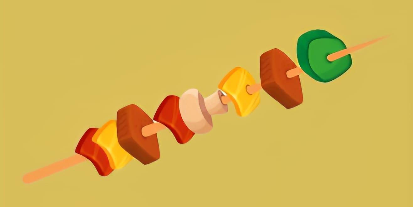 1. Špíz se špalíčky z mletého vepřového masa balenými ve slanině s paprikou a cibulkou, podávaný se salátkem coleslaw a vařenými bramborami 159 CZK